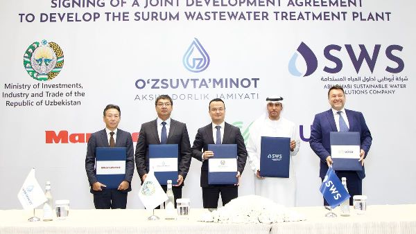 أبرم تحالف يضم شركة أبوظبي لحلول المياه المستدامة، وماروبيني اليابانية، وسويز الفرنسية اتفاقية تطوير مشتركة مع وزارة الاستثمار والصناعة والتجارة في أوزبكستان وشركة أوسفيتامينوت. ويهدف هذا التعاون إلى تطوير أكبر محطة لمعالجة مياه الصرف الصحي في طشقند، بقيمة تزيد عن مليار دولار أمريكي. وستعالج المنشأة 1.5 مليون متر مكعب من المياه يوميًا عند اكتمالها.