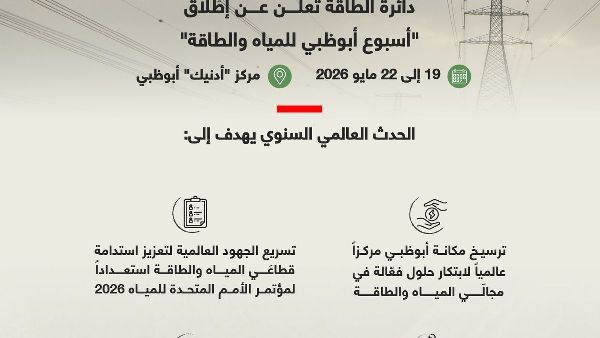 تستضيف أبوظبي الدورة الافتتاحية من "أسبوع أبوظبي للمياه والطاقة" في الفترة من 19 إلى 22 مايو 2026، في شركة أبوظبي الوطنية للطاقة (أدنيك). تهدف هذه المبادرة، التي يشرف عليها سمو الشيخ خالد بن محمد بن زايد آل نهيان، إلى ترسيخ مكانة أبوظبي كوجهة رائدة في مجال حلول المياه والطاقة المبتكرة. ويتزامن هذا الحدث مع الاستعدادات لمؤتمر الأمم المتحدة للمياه 2026.