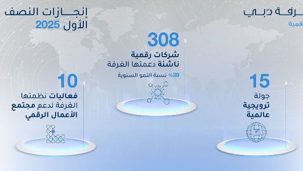 دعمت غرفة دبي للاقتصاد الرقمي، التابعة لغرف دبي، نمو 308 شركات رقمية ناشئة في الإمارة خلال النصف الأول من عام 2025. ويمثل هذا زيادة بنسبة 39% مقارنة بـ 221 شركة تم دعمها في الفترة نفسها من العام الماضي. وتُعد جهود الغرفة محورية في تعزيز جاذبية دبي كمركز لرواد الأعمال والشركات الناشئة في مختلف القطاعات الرقمية.