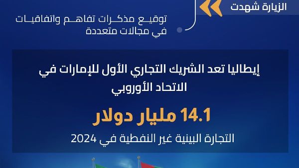 خلال منتدى الأعمال الإماراتي الإيطالي، استكشف قادة الأعمال من كلا البلدين العديد من الفرص. وتم توقيع اتفاقيات لتعزيز التعاون في قطاعات الاقتصاد المستقبلي. تظل إيطاليا الشريك التجاري الأول لدولة الإمارات العربية المتحدة داخل الاتحاد الأوروبي، حيث سيصل حجم التجارة غير النفطية إلى 14.1 مليار دولار في عام 2024، بزيادة قدرها 21٪ عن عام 2023.