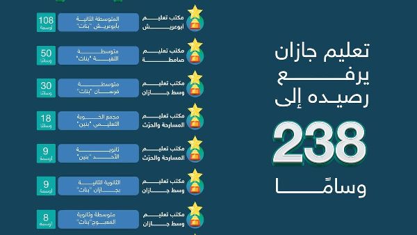 وكانت المدرسة المتوسطة الثانية للبنات في أبو عريش هي الرائدة في هذه المجموعة الرائعة من الجوائز، حيث حصلت وحدها على 108 ميداليات. وجاءت في المركز التالي مدرسة اللقية الثانوية للبنات بـ 50 ميدالية، ومدرسة الفرسان المتوسطة للبنات بـ 30 ميدالية. كما قدم مجمع الخوبة التعليمي للبنين ومدرسة العهد الثانوية للبنين مساهمات كبيرة بحصولهما على 18 و9 ميداليات على التوالي. كما حصلت كل من مدرسة جازان الثانوية الثانية للبنات ومدرسة المعبوج المتوسطة والثانوية على 9 و8 ميداليات على التوالي، فيما حصلت مدرسة القروي الثانوية للبنين على 6 ميداليات.