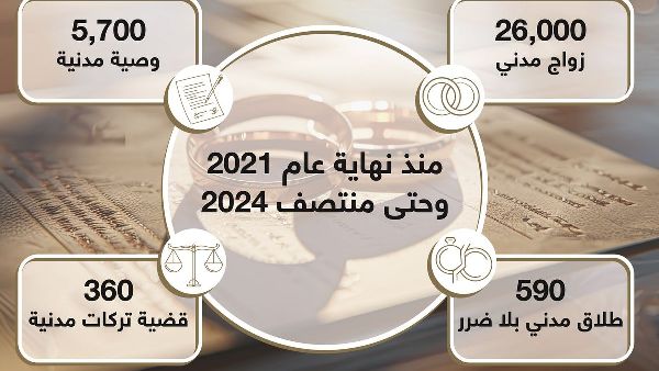 تعاملت دائرة القضاء في أبوظبي مع أكثر من 8 آلاف طلب زواج مدني خلال النصف الأول من عام 2024، أي ما يعادل نحو 70 طلباً يومياً. ومنذ صدور قانون الزواج المدني وآثاره في إمارة أبوظبي رقم 14 لسنة 2021، تم تسجيل ما مجموعه 26 ألف عقد زواج مدني لمختلف الجنسيات والأديان والأعراق.