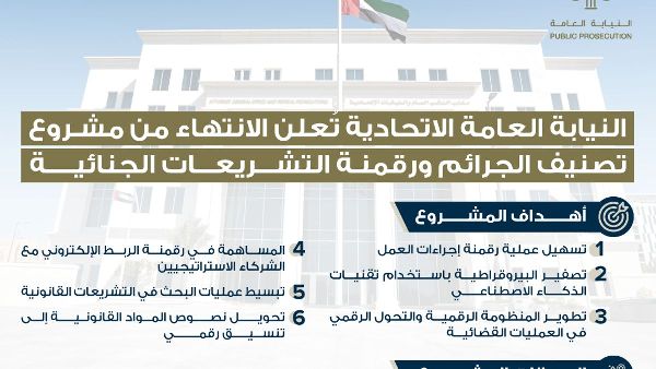 ويستخدم المشروع الذي يحمل عنوان "تصنيف الجرائم ورقمنة التشريعات الجنائية في نظام إدارة القضايا الجنائية" تقنيات الذكاء الاصطناعي لتحويل النصوص القانونية إلى صيغة رقمية. ويسهل هذا التحويل تطبيق القانون بشكل أكثر كفاءة وشفافية من خلال أنظمة المعلومات المتقدمة. ويؤكد هذا المسعى التزام دولة الإمارات العربية المتحدة بتحقيق الريادة في التحول الرقمي في جميع القطاعات، بما في ذلك القضاء.