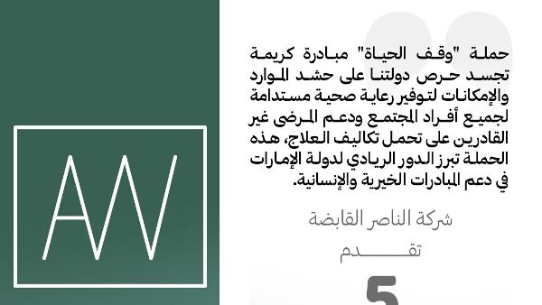 تعهدت شركة الناصر القابضة بالتبرع بمبلغ 5 ملايين درهم إماراتي لحملة "وقف الحياة". تهدف هذه المبادرة، التي أطلقتها هيئة الأوقاف في أبوظبي بالتعاون مع دائرة الصحة في أبوظبي، إلى دعم المرضى المصابين بأمراض مزمنة. شعار الحملة "معكم مدى الحياة"، وتسعى إلى توفير حلول رعاية صحية طويلة الأمد.