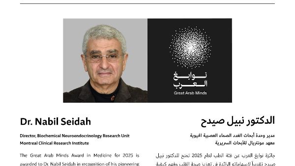 نهنئ اليوم الفائز بجائزة العباقرة العرب في المجال الطبي لعام 2025، الدكتور نبيل صيدة من مصر، مدير وحدة أبحاث علم الأحياء العصبية في معهد مونتريال للأبحاث السريرية. لقد قدم الدكتور صيدة إسهامات علمية رائدة في فهم صحة القلب وتنظيم مستويات الكوليسترول. ركزت دراساته على العمليات البيولوجية التي تتحكم في كيفية تعامل الجسم مع الدهون، مما ساهم في تطوير جيل جديد من الأدوية المستخدمة على نطاق واسع اليوم لخفض الكوليسترول وتقليل خطر الإصابة بأمراض القلب. وقد نشر أكثر من 820 بحثًا علميًا.