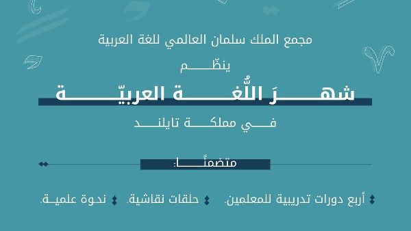 أطلقت أكاديمية الملك سلمان العالمية للغة العربية في تايلاند خلال شهر نوفمبر الجاري برنامج "شهر اللغة العربية"، بالتعاون مع جامعة كروك في بانكوك وجامعة الأمير سونغكلا في هات ياي، بهدف تعزيز تعليم اللغة العربية، حيث بدأ البرنامج بمسابقة علمية تركز على الإلقاء للطلاب الذين يتعلمون اللغة العربية في هذه الجامعات.