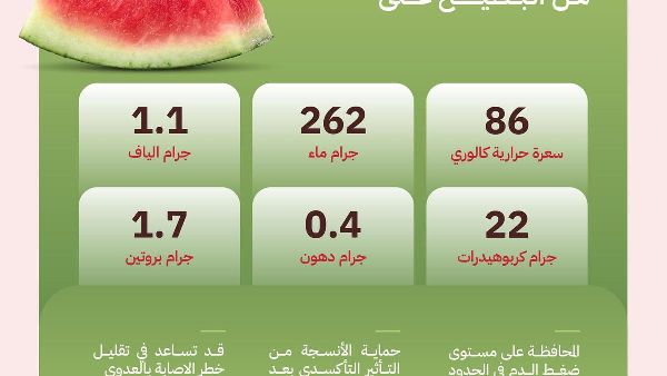 وكشفت دراسة لوزارة البيئة والمياه والزراعة أن 285 جراماً من البطيخ تحتوي على 262 جراماً من الماء، و86 سعراً حرارياً، و22 جراماً من الكربوهيدرات، و1.7 جراماً من البروتين، و1.1 جراماً من الألياف، ونحو 0.4 جراماً من الدهون. وهذا يسلط الضوء على البطيخ كمنتج رئيسي في تعزيز الأمن الغذائي.