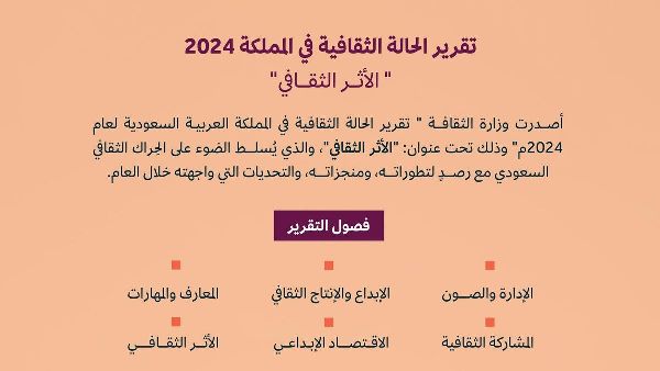 أصدرت وزارة الثقافة في المملكة العربية السعودية "تقرير الوضع الثقافي في المملكة العربية السعودية لعام ٢٠٢٤" بعنوان "التأثير الثقافي". يتناول هذا التقرير التقدم والإنجازات والتحديات التي واجهت المشهد الثقافي السعودي خلال العام الماضي. وينقسم إلى ستة فصول: الإدارة والحفظ، والإبداع والإنتاج الثقافي، والمعرفة والمهارات، والمشاركة الثقافية، والاقتصاد الإبداعي، والتأثير الثقافي.