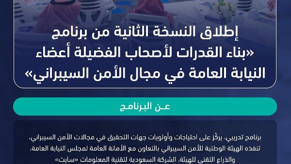 أطلقت الهيئة الوطنية للأمن السيبراني النسخة الثانية من برنامج "بناء قدرات أعضاء النيابة العامة في مجال الأمن السيبراني"، وتهدف هذه المبادرة إلى تعزيز مهارات وقدرات الأمن السيبراني لأعضاء النيابة العامة ودعم عملهم والمساهمة في حماية الفضاء الإلكتروني في المملكة العربية السعودية.