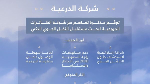 يمثل هذا التعاون خطوةً مهمةً نحو تحقيق رؤية السعودية 2030 بتحويل الدرعية إلى وجهة عالمية رائدة. وتَعِد خدمات النقل الجوي الحضري المبتكرة بتجربة مميزة للزوار، مع تعزيز مكانة الدرعية على خريطة السياحة العالمية.