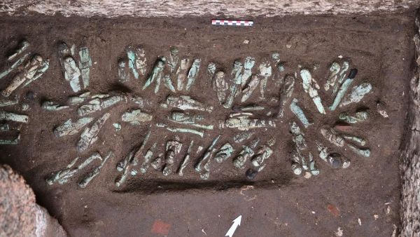 اكتُشفت التماثيل في 9 أكتوبر/تشرين الأول داخل مقبرة ضيقة تضم تابوتًا كبيرًا من الجرانيت غير منقوش. رُتبت بدقة على شكل نجمة حول حفرة شبه منحرفة، وفي صفوف أفقية عند قاعدتها. يعكس هذا الترتيب طقوس الدفن المُعقدة في تلك الحقبة، مُبرزًا الأهمية الثقافية لهذه الممارسات.