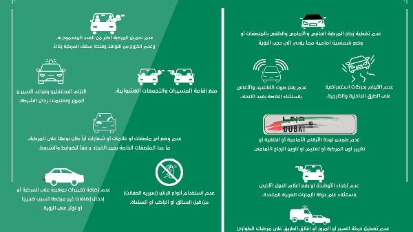 وأكد اللواء المزروعي أنه يمنع القيام بحركات بهلوانية على الطرق أو تعطيل حركة السير أو إغلاق الطرق، كما يمنع تزويد المركبات بمواد تصدر أصواتاً أو تعديل محركاتها دون ترخيص، كما يمنع إضافة مواد تؤثر على الرؤية.