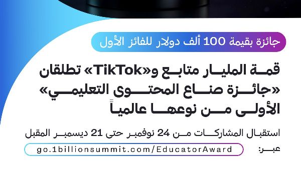 تعاونت قمة المليار متابع مع تيك توك لإطلاق "جائزة المبدعين التعليميين"، وهي مبادرة عالمية رائدة تُكرّم مبدعي المحتوى الذين يُعيدون صياغة التعليم الإلكتروني. تفتح هذه الجائزة أبوابها لتقديم المشاركات من المبدعين في الشرق الأوسط وشمال أفريقيا وأفريقيا والمملكة المتحدة والولايات المتحدة الأمريكية حتى 21 ديسمبر. وتهدف الجائزة إلى تسليط الضوء على المحتوى التعليمي الذي يُلهم المجتمعات ويُحدث تأثيرًا ملموسًا.