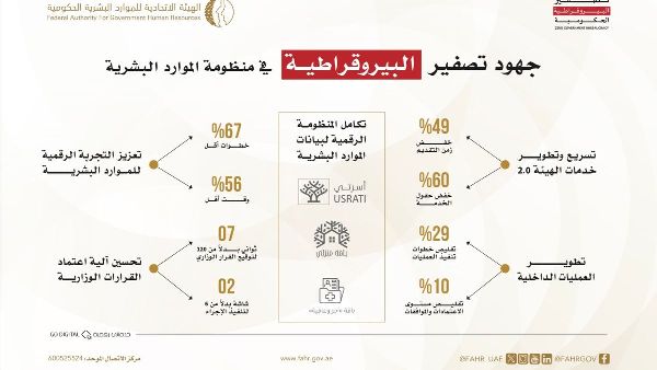 حققت الهيئة الاتحادية للموارد البشرية الحكومية تقدماً ملحوظاً في إطار برنامج "صفر بيروقراطية"، الذي يهدف إلى تبسيط إجراءات الموارد البشرية الاتحادية، وتعزيز كفاءة وجودة العمل الحكومي. وتضمنت حملة "معاً نحو صفر بيروقراطية" لقاءات وورش عمل لتحليل وتنقيح الإجراءات.