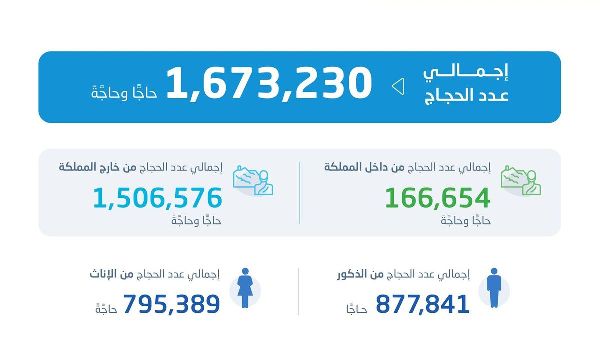 كما أشارت نشرة الهيئة العامة للإحصاء إلى أن عدد الحجاج الذكور بلغ 877,841 حاجًا من إجمالي حجاج الداخل والخارج، بينما بلغ عدد الحجاج الإناث 795,389 حاجًا. وتعكس هذه الأرقام عملية جمع وتحليل شاملة للبيانات أجرتها الهيئة العامة للإحصاء باستخدام السجلات الإدارية لوزارة الداخلية.