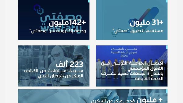 يُسلّط التقرير الضوء أيضًا على التطورات في مجال التحوّل الرقمي في مجال الصحة. إذ يضم تطبيق "صحتي" الآن أكثر من 31 مليون مستخدم. كما تم إصدار أكثر من 142 مليون وصفة طبية إلكترونية عبر خدمة "وصفتي" خلال العام.
