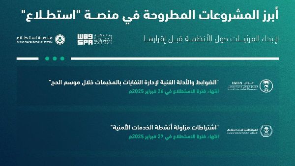 طرحت منصة المركز الوطني للتنافسية (استثثلة) 20 مشروعاً تركز على القضايا الاقتصادية والتنموية، وتدعو المبادرة بالتعاون مع 8 جهات حكومية، القطاعين العام والخاص إلى إبداء الرأي قبل الموافقة النهائية عليها، ومن بين هذه المشاريع مشروع "الضوابط الفنية والإرشادات لإدارة النفايات في المخيمات خلال موسم الحج"، والذي يهدف إلى وضع إرشادات لإدارة النفايات في المشاعر المقدسة خلال موسم الحج.