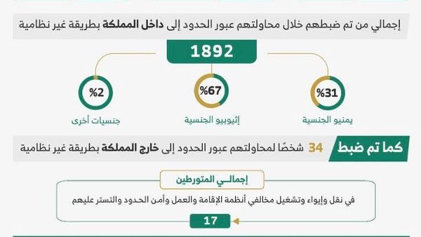خلال هذه الفترة، أوقفت السلطات 1892 شخصًا حاولوا دخول المملكة بطريقة غير شرعية. 31% منهم يمنيون، و67% إثيوبيون. ونسبة ضئيلة بلغت 0.2% من جنسيات أخرى. كما أُلقي القبض على 34 شخصًا أثناء محاولتهم مغادرة المملكة بطريقة غير شرعية.