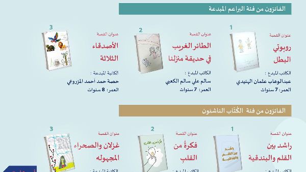 في الفئة العمرية 7-9 سنوات، فاز عبد الوهاب عثمان الهنيدي بالمركز الأول عن قصته "روبوتي البطل". وحصل سالم علي سالم الكعبي على المركز الثاني عن قصته "الطائر الغريب في حديقتنا"، بينما حصلت حصة حمد أحمد المزروعي على المركز الثالث عن قصتها "الأصدقاء الثلاثة". وفي الفئة العمرية 10-15 سنة، فاز سليمان عبد الحليم بالمركز الأول عن قصته "راشد بين القلم والبندقية".