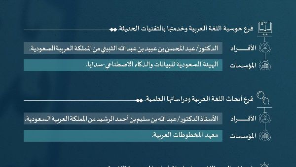 حصل الأستاذ الدكتور عبد المحسن بن عبيد الثبيتي من المملكة العربية السعودية على جائزة في مجال الحوسبة للأفراد، ومن أعماله مشاريع مثل التصنيف الآلي للنصوص العربية وتطوير أنظمة المجموعات اللغوية مثل الغواص والمسبح.