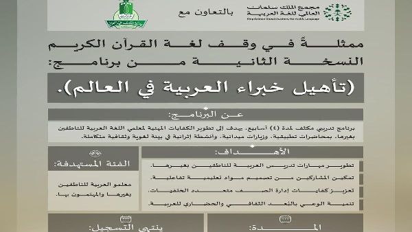 أعلنت أكاديمية الملك سلمان العالمية للغة العربية عن فتح باب التسجيل في الدورة الثانية من برنامج "تأهيل خبراء اللغة العربية في العالم". تهدف هذه المبادرة، بالتعاون مع جامعة الملك عبد العزيز، إلى تطوير مهارات معلمي اللغة العربية الذين يُدرّسون غير الناطقين بها. يستمر البرنامج لمدة أربعة أسابيع، ويجمع بين التدريب النظري والعملي.