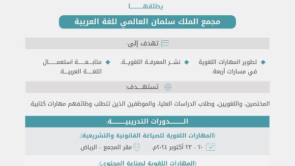 أطلقت أكاديمية الملك سلمان العالمية للغة العربية أربع دورات تدريبية لتعزيز المهارات اللغوية، وتركز هذه الدورات على الصياغة القانونية، وإنشاء المحتوى، والبحث العلمي، ومهارات الاختصار، وذلك تماشياً مع الأهداف الاستراتيجية للأكاديمية وبرنامج تنمية القدرات البشرية ضمن رؤية المملكة العربية السعودية 2030.