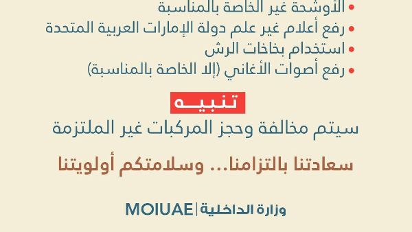 يُمنع تشغيل الموسيقى الصاخبة والأناشيد إلا في حال الموافقة على ذلك في اليوم الوطني. يجب أن تبقى لوحات السيارات ظاهرة، ويُمنع تغيير لون السيارة أو تظليل زجاجها الأمامي. على محلات الزينة الالتزام بهذه الإرشادات، وذلك بتركيب أعلام دولة الإمارات العربية المتحدة أو الملصقات المعتمدة فقط، وتجنب أعلام الدول الأخرى خلال الاحتفالات.