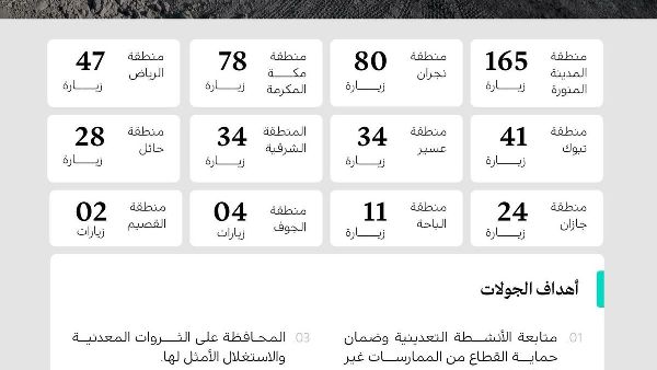 أجرت وزارة الصناعة والثروة المعدنية في المملكة العربية السعودية، من خلال هيئة الإشراف على عمليات التعدين التابعة لها، 548 عملية تفتيش في مواقع التعدين في جميع أنحاء المملكة خلال شهر سبتمبر. هدفت هذه العمليات إلى ضمان الالتزام بنظام الاستثمار التعديني. واعتمدت نهجًا يتمثل في إصدار الإنذارات قبل فرض العقوبات على أي مخالفات.