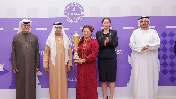 اختتمت اليوم منافسات بطولة آسيا للسيدات للشطرنج بتكريم معالي الشيخ نهيان بن مبارك آل نهيان وزير التسامح والتعايش، للفائزات في البطولة التي نظمتها الوزارة بالتعاون مع هيئات الشطرنج العالمية ونادي أبوظبي للشطرنج والألعاب الذهنية، ضمن فعاليات دورة الألعاب التسامحية، بمشاركة 68 بطلة وبطل من 16 دولة، من بينها تركمانستان والهند والإمارات.
