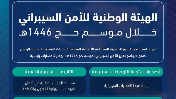 أعلنت الهيئة الوطنية للأمن السيبراني عن استفادة أكثر من 300 جهة وطنية وأكثر من مليون حاج من برنامج تعزيز الأمن السيبراني لموسم حج 1446هـ. وهدفت هذه المبادرة إلى تعزيز الجاهزية السيبرانية للأنظمة والخدمات التقنية خلال موسم حج هذا العام، وتطوير مهارات المتخصصين في الأمن السيبراني، وزيادة الوعي بالأمن السيبراني لدى الحجاج وموظفي الجهات الوطنية المشاركة.