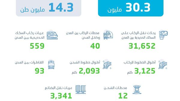أصدرت الهيئة العامة للإحصاء في السعودية إحصاءات النقل بالسكك الحديدية لعام 2023، وأظهرت البيانات ارتفاع أعداد ركاب السكك الحديدية بنسبة 33% مقارنة بعام 2022. وبلغت نسبة الركاب داخل المدن 72.5%، حيث قطعوا أكثر من مليون كيلومتر. في حين بلغت نسبة الركاب بين المدن 27.5%، حيث قطعوا 31.700 رحلة لمسافة 10.4 مليون كيلومتر.