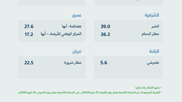 وأوضح التقرير أنه في منطقة الشرقية التي شهدت أعلى كميات هطول الأمطار، سجلت محطة الخبر (39.00) ملم ومحطة مطار الدمام (36.2) ملم. وشهدت محطة عدادة – أبها بعسير هطول أمطار بلغت (27.6) ملم، فيما سجل المركز الوطني للأرصاد الجوية – أبها هطول (17.2) ملم.