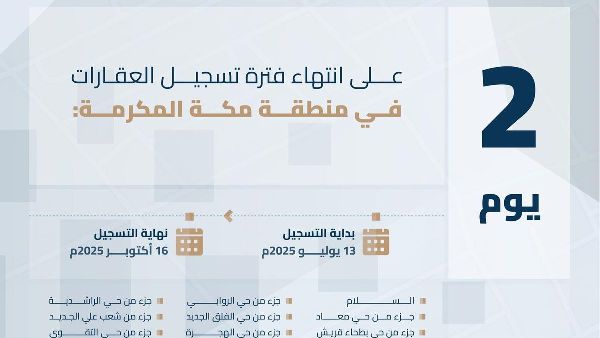 أعلنت الهيئة العامة للعقار عن اقتراب الموعد النهائي للتسجيل العيني الأولي لـ 108,290 قطعة أرض عقارية في مكة المكرمة والمدينة المنورة والمنطقة الشرقية. وحددت الهيئة يوم الخميس 24 ربيع الثاني 1447 هـ. وتهيب بالملاك سرعة التسجيل لتجنب الغرامات.