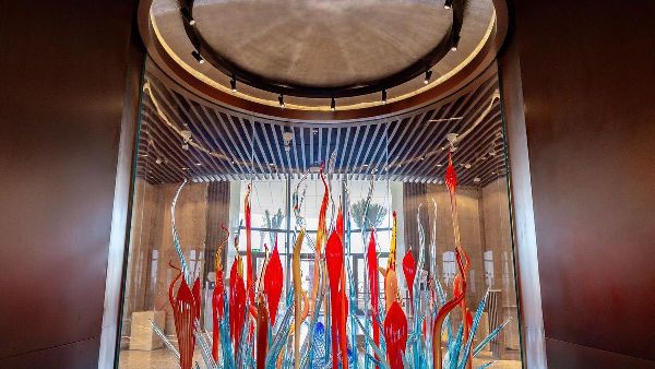 العمل الفني الثاني، المسمى "سيمفونية الزجاج"، يتألف من أربع قطع زجاجية موزعة في صالات المطار. تُجسّد هذه المنحوتات جمال الشعاب المرجانية والأعشاب البحرية في البحر الأحمر. تستخدم ألوانًا زاهية وتقنيات دقيقة لإبراز التنوع البيئي والتأكيد على أهمية الحفاظ على المحيطات.
