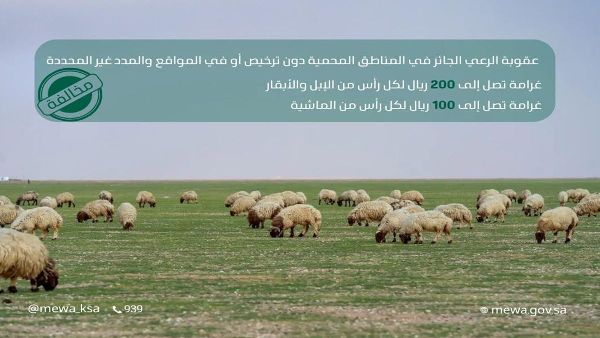 تُشدد الوزارة على أهمية تنظيم تراخيص الرعي وتطبيق العقوبات على المخالفين. وتُحدد غرامات الرعي الجائر في المناطق المحمية أو غير المخصصة بـ 200 ريال لكل رأس من الإبل أو الماشية، و100 ريال لكل رأس من الماشية. وتهدف هذه الإجراءات إلى الحد من الممارسات الضارة التي تُهدد الاستدامة البيئية.