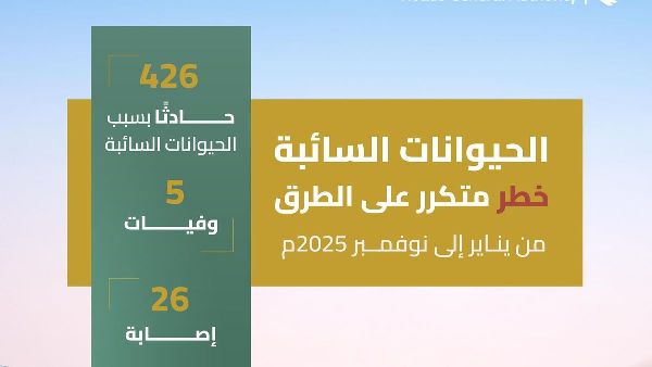 هيئة الطرق السعودية تكشف عن إحصائيات حوادث الحيوانات الضالة وسلامة عبور الجمال حتى عام 2025