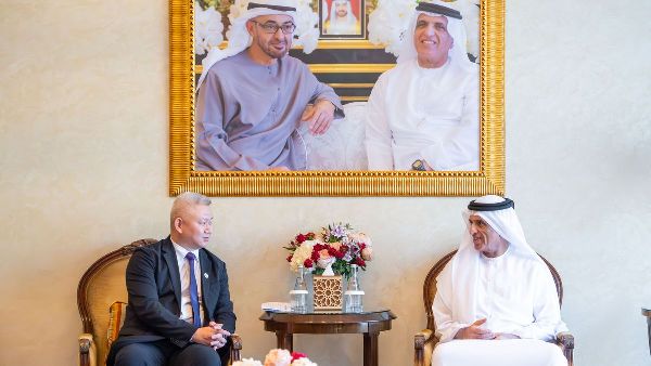 الشيخ سعود بن صقر بن محمد آل نهيان، حاكم رأس الخيمة، يستقبل وفداً من جامعة قوانغتشو للطب الصيني