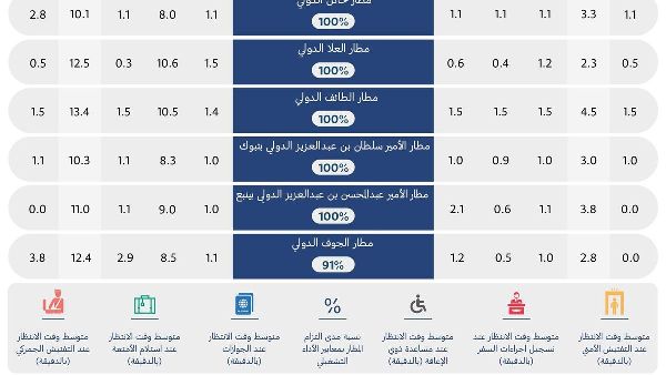 حقق مطار عرعر المركز الأول بين المطارات الداخلية بنسبة مثالية 100%، متفوقاً في متوسط أوقات الانتظار لرحلات المغادرة والوصول.