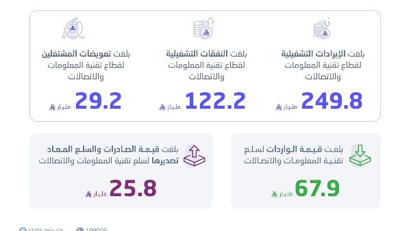شكلت معدات الاتصالات الفئة الأكبر ضمن واردات تكنولوجيا المعلومات والاتصالات، بقيمة بلغت 36.8 مليار ريال سعودي. وفي الوقت نفسه، ارتفعت صادرات وإعادة تصدير سلع تكنولوجيا المعلومات والاتصالات من 11.8 مليار ريال سعودي في عام 2023 إلى 25.8 مليار ريال سعودي في عام 2024، مسجلةً نمواً بنسبة 118%.