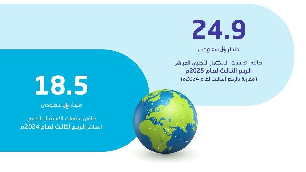 ارتفع صافي الاستثمار الأجنبي المباشر في المملكة العربية السعودية خلال الربع الثالث من عام 2025، حيث بلغت التدفقات 24.9 مليار ريال سعودي. ويمثل هذا نمواً بنسبة 34.5% مقارنةً بالفترة نفسها من عام 2024، حين بلغ صافي التدفقات 18.5 مليار ريال سعودي.