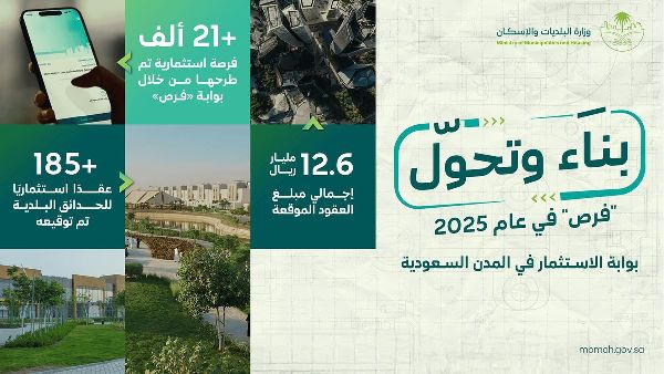 أعلنت وزارة البلديات والإسكان عن توفير أكثر من 21 ألف فرصة استثمارية من خلال بوابة الاستثمار "فراس" في مختلف المدن السعودية خلال عام 2025. وتم توقيع عقود بقيمة تزيد عن 12.6 مليار ريال سعودي بموجب نظام الاستثمار البلدي المعتمد، مما يسلط الضوء على المشاركة المتزايدة للقطاع الخاص في المشاريع البلدية.