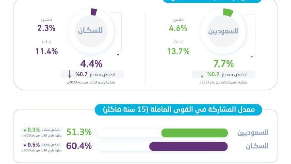 ومع ذلك، شهدت معدلات المشاركة في القوى العاملة انخفاضًا طفيفًا في الربع الرابع من عام 2023. وانخفض معدل المشاركة الإجمالي، الذي يشمل السعوديين وغير السعوديين، إلى 60.4%، وانخفض معدل السعوديين إلى 51.3%. كما شهدت نسبة مشاركة المرأة السعودية انخفاضا لتستقر عند 35.5%، كما حدث انخفاض هامشي في مشاركة الذكور إلى 66.6%.
