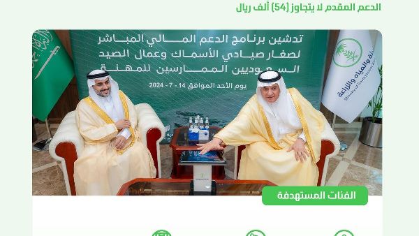 أطلق المهندس عبد الرحمن بن عبد المحسن الفضلي وزير البيئة والمياه والزراعة برنامج الدعم المالي المباشر للصيادين السعوديين. وتهدف هذه المبادرة، التي تأتي ضمن برنامج "الشعاب السعودية"، إلى تطوير قطاع الثروة السمكية وتشجيع الصيد كمهنة. يتماشى البرنامج مع أهداف رؤية 2030 لدعم الاقتصاد المحلي.