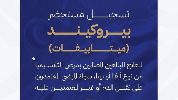 وافقت الهيئة العامة للغذاء والدواء السعودية (SFDA) على دواء بيروكند (ميتابيفات) لعلاج البالغين المصابين بثلاسيميا ألفا أو بيتا. ويشمل هذا الاعتماد المرضى المعتمدين وغير المعتمدين على نقل الدم. وكان بيروكند قد اعتُبر سابقًا منتجًا واعدًا ضمن برنامج الأدوية الواعدة، الذي يهدف إلى تسريع الوصول إلى العلاجات المبتكرة.