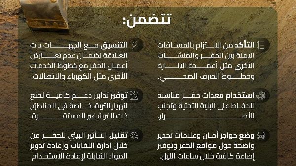 أكدت الهيئة العامة للطرق والجسور على أهمية التنسيق مع الجهات المعنية لمنع تعارض أعمال الحفر مع خطوط الخدمات الأخرى، كالكهرباء والاتصالات. كما ألزمت الهيئة بالحفاظ على مسافات آمنة من المرافق، كأعمدة الإنارة وخطوط الصرف الصحي، واستخدام معدات حفر مناسبة للحفاظ على سلامة البنية التحتية وتجنب الأضرار.