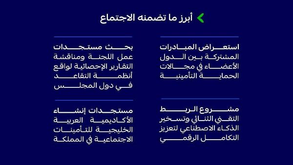 بحثت اللجنة عدة مبادرات، منها مشروع الربط الفني الثنائي لتعزيز التكامل الرقمي بين الدول الأعضاء. كما وُضعت خطط للندوة الدورية الثامنة عشرة بعنوان "تسخير تقنيات الذكاء الاصطناعي في مؤسسات التأمينات الاجتماعية"، المقرر عقدها عام ٢٠٢٦، والتي ستقدمها المؤسسة العامة للتأمينات الاجتماعية.