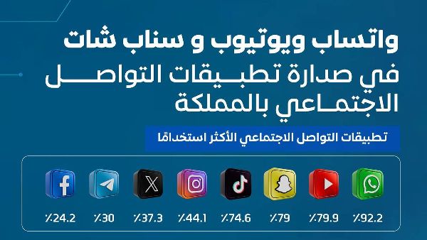 يُسلّط تقرير "الإنترنت السعودي 2024" الصادر عن هيئة الاتصالات والفضاء والتقنية الضوء على هيمنة تطبيقات التواصل الاجتماعي في المملكة العربية السعودية. ويتصدر واتساب قائمة التطبيقات بنسبة استخدام بلغت 92.2% بين مستخدمي الإنترنت، يليه يوتيوب بنسبة 79.9%، ثم سناب شات بنسبة 79%. وتحظى هذه المنصات بشعبية واسعة بين جميع الفئات العمرية للتواصل ومشاركة المحتوى والتعليم والعمل والترفيه.