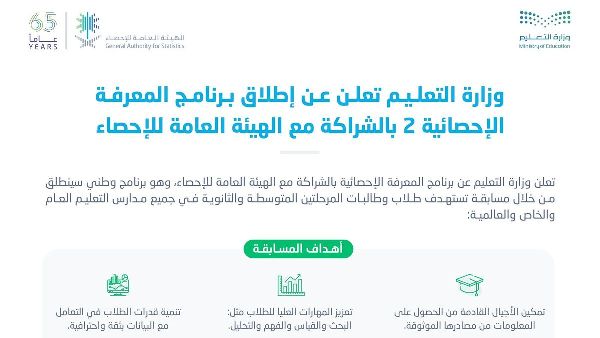 دعت الهيئة العامة للإحصاء جميع المهتمين بوزارة التعليم للمشاركة في مسابقة المعرفة والأنشطة الأخرى المرتبطة ببرنامج المعرفة الإحصائية. ويمكن للمشاركين الاطلاع على مزيد من المعلومات عبر الرابط: https://www.stats.gov.sa/knowledge-competition.