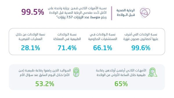 أصدرت الهيئة العامة للإحصاء في المملكة العربية السعودية نشرة إحصاءات صحة المرأة والرعاية الإنجابية لعام 2024. وأبرز التقرير أن 71.4% من الولادات في المملكة طبيعية، بينما شكلت العمليات القيصرية 27.1% بين النساء في الفئة العمرية من 15 إلى 49 عامًا. وكان هناك تواجد لمتخصصين صحيين مهرة خلال 99.6% من الولادات.
