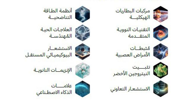 يُحدد التقرير العديد من التقنيات الناشئة التي من شأنها إحداث نقلة نوعية في مختلف القطاعات. وتشمل هذه التقنيات تسخير الطاقة المستدامة لإنتاج النيتروجين الأخضر، وإعادة استخدام أدوية الأمراض المزمنة لعلاج الحالات العصبية، واستخلاص الطاقة من واجهات المياه المالحة والعذبة، وأجهزة الاستشعار المتصلة التي تتشارك المعلومات آنيًا. وتشمل الابتكارات الأخرى إنزيمات نانوية مصنعة في المختبرات، وأجهزة استشعار ذكية صغيرة لمراقبة الصحة أو البيئة، وتقنيات نووية متقدمة للطاقة النظيفة، ووضع علامات مائية على محتوى الذكاء الاصطناعي، وبكتيريا مفيدة تُقدم العلاجات داخليًا، ومكونات بطاريات متطورة وخفيفة الوزن.